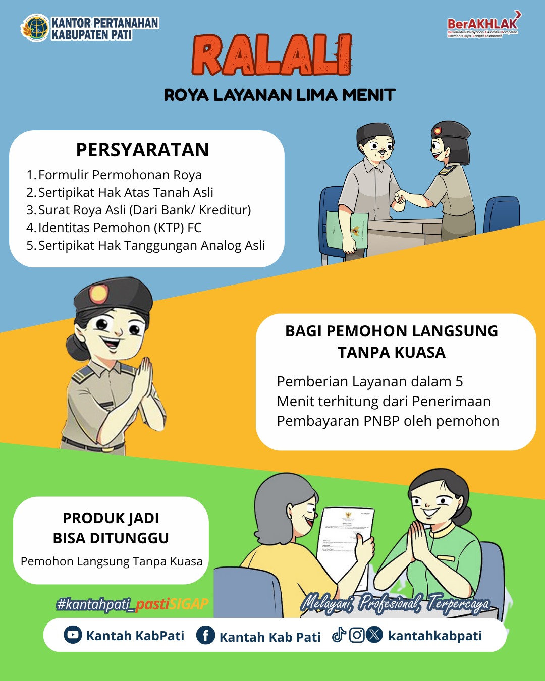 Kini di Kantor Pertanahan Kabupaten Pati hadir inovasi layanan RA LALI (Roya Layanan Lima Menit) bagi pemohon tanpa kuasa.