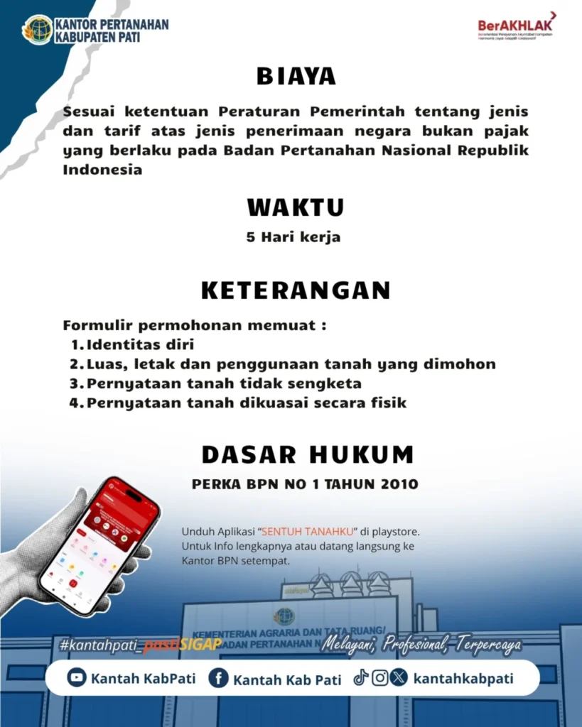 Pengurusan dapat dilakukan langsung di loket pelayanan Kantor Pertanahan Kabupaten Pati. Kami juga menyediakan akses digital melalui aplikasi “Sentuh Tanahku” yang bisa Anda unduh di Playstore.