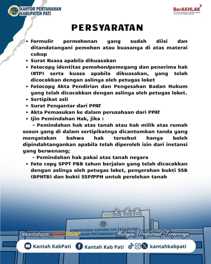 Kami di Kantor Pertanahan Kabupaten Pati siap membantu Anda mengurus peralihan hak ini. Prosesnya melibatkan Pejabat Pembuat Akta Tanah (PPAT) yang menyusun akta peralihan, serta dokumen pendukung sesuai peraturan perundang-undangan.