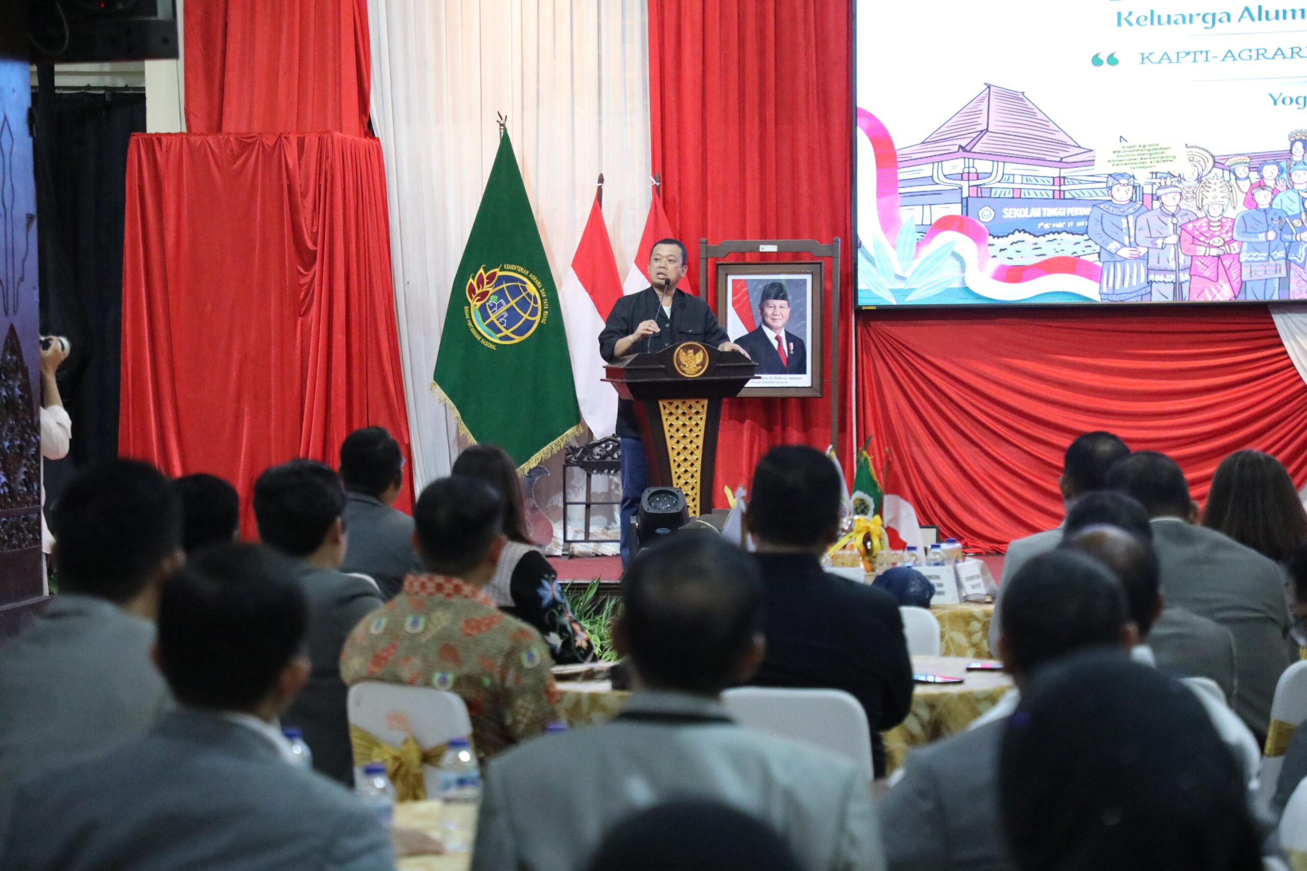 Sleman – Menteri Agraria dan Tata Ruang/Kepala Badan Pertanahan Nasional (ATR/BPN), Nusron Wahid, memberikan pengarahan dalam Musyawarah Nasional Keluarga Alumni Pendidikan Tinggi Agraria (KAPTI-Agraria) Tahun 2025. Ia menegaskan bahwa Kementerian ATR/BPN sangat mengandalkan kualitas sumber daya manusia (SDM), yang sebagian besar merupakan alumni Sekolah Tinggi Pertanahan Nasional (STPN).