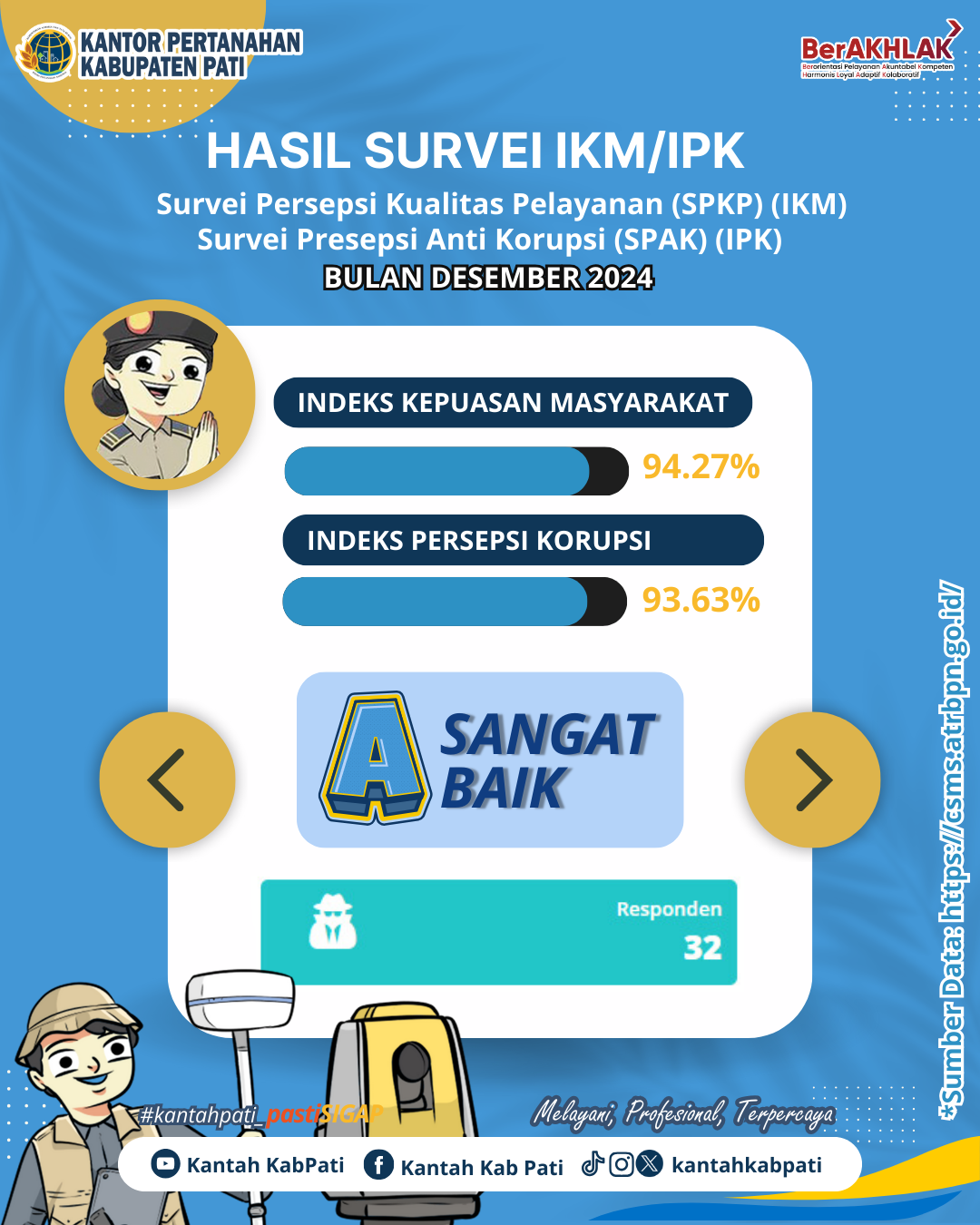 Berikut adalah Hasil Survei Persepsi Kualitas Pelayanan (SPKP) Indeks Kepuasan Masyarakat (IKM) dan Survei Persepsi Anti Korupsi (SPAK) Indeks Persepsi Korupsi (IPK) pada pelayanan pertanahan di Kantor Pertanahan Kabupaten Pati Bulan Desember 2024.