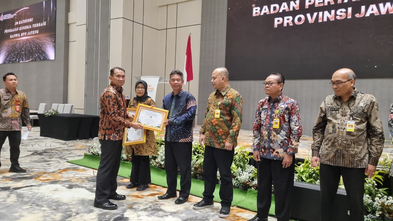 Senin, 12 Januari 2026 – Dalam rangkaian kegiatan Evaluasi Kinerja Tahun 2025 dan Penyusunan Rencana Aksi Tahun 2026 di lingkungan Kantor Wilayah BPN Provinsi Jawa Tengah, Kantor Pertanahan Kabupaten Pati berhasil meraih dua penghargaan kinerja Tahun 2025. Penghargaan diterima langsung oleh Kepala Kantor Pertanahan Kabupaten pati, Winarto.