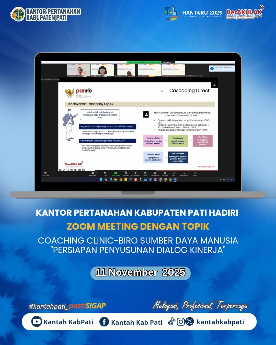 Kantor Pertanahan Kabupaten Pati hari ini mengikuti Coaching Clinic yang diselenggarakan oleh Biro Sumber Daya Manusia dengan tema “Persiapan Penyusunan Dialog Kinerja”.