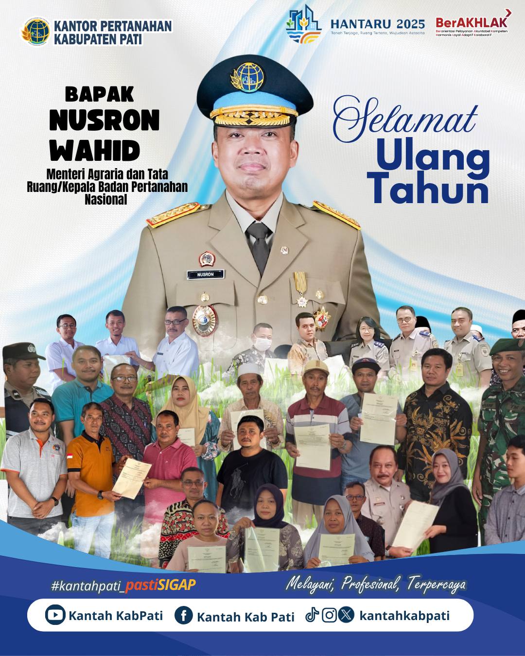 Segenap keluarga besar Kantor Pertanahan Kabupaten Pati mengucapkan Selamat Ulang Tahun Menteri ATR/Kepala BPN, Bapak Nusron Wahid.