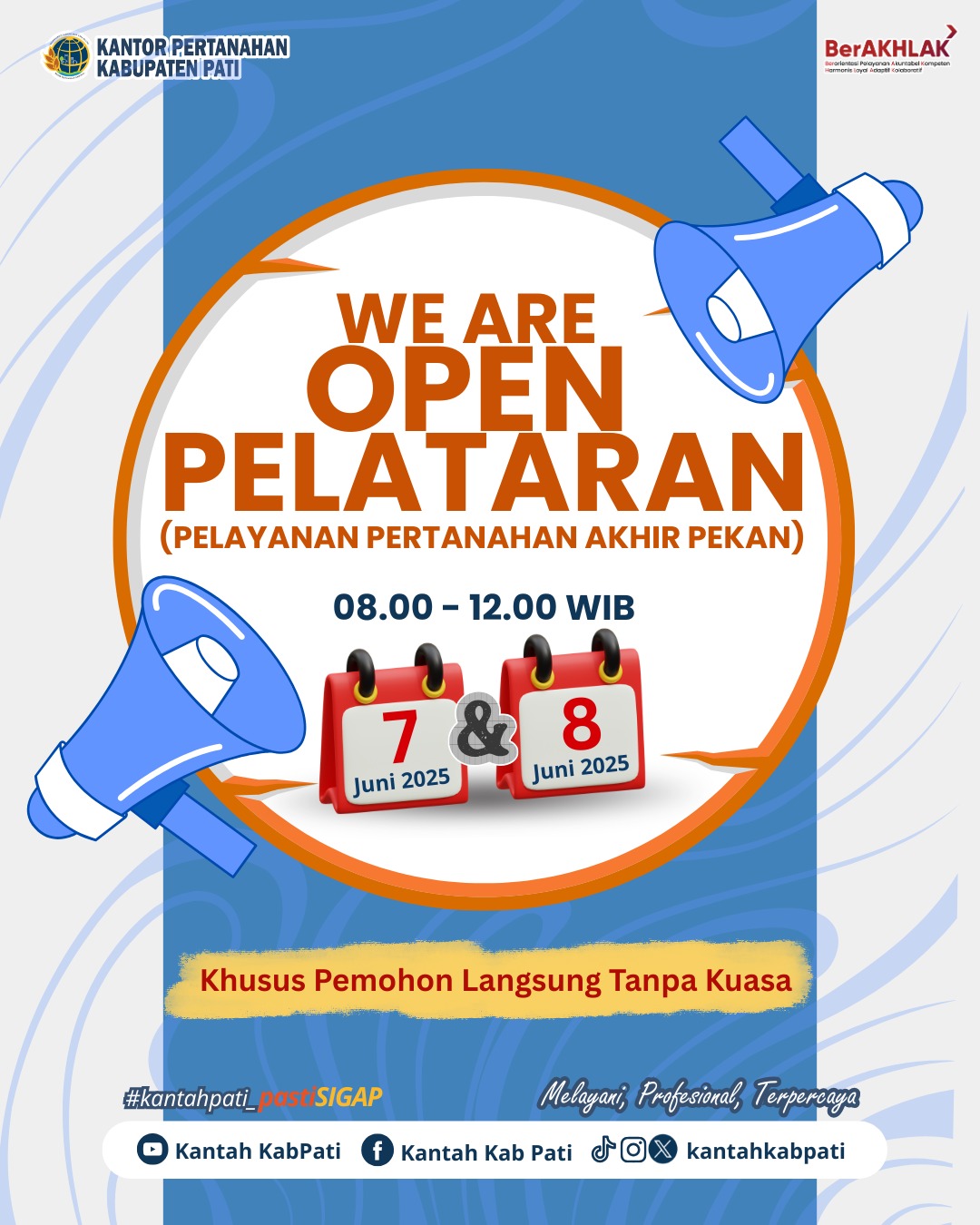 Hari Sabtu dan Minggu pada tanggal 7 dan 8 Juni 2025, Kantor Pertanahan Kabupaten Pati TETAP BUKA Pelayanan Pertanahan Akhir Pekan (PELATARAN) untuk memberikan kemudahan bagi masyarakat dalam mengurus sertipikat tanah di akhir pekan. Pelayanan ini tersedia mulai pukul 08.00 hingga 12.00 WIB. Khusus untuk pemohon langsung tanpa kuasa.