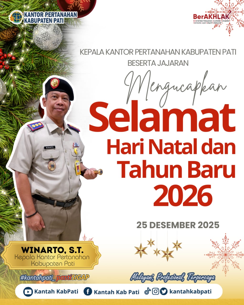 Kepala Kantor Pertanahan Kabupaten Pati beserta jajaran mengucapkan Selamat Natal dan Tahun Baru 2026.