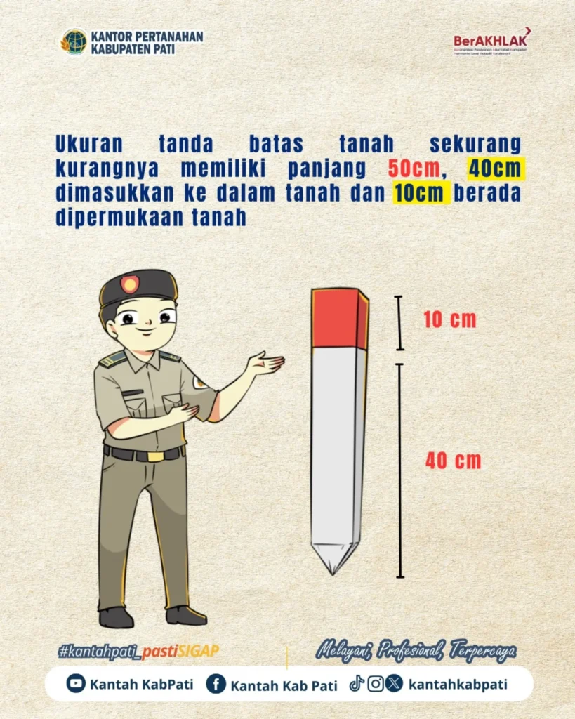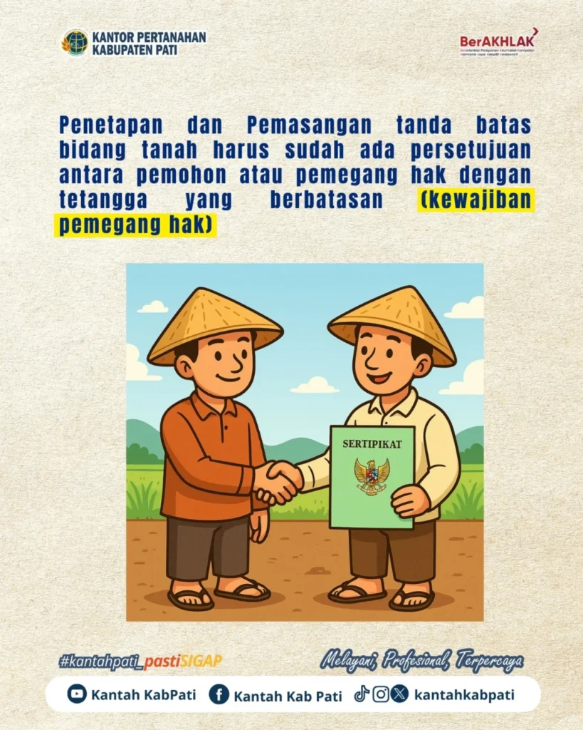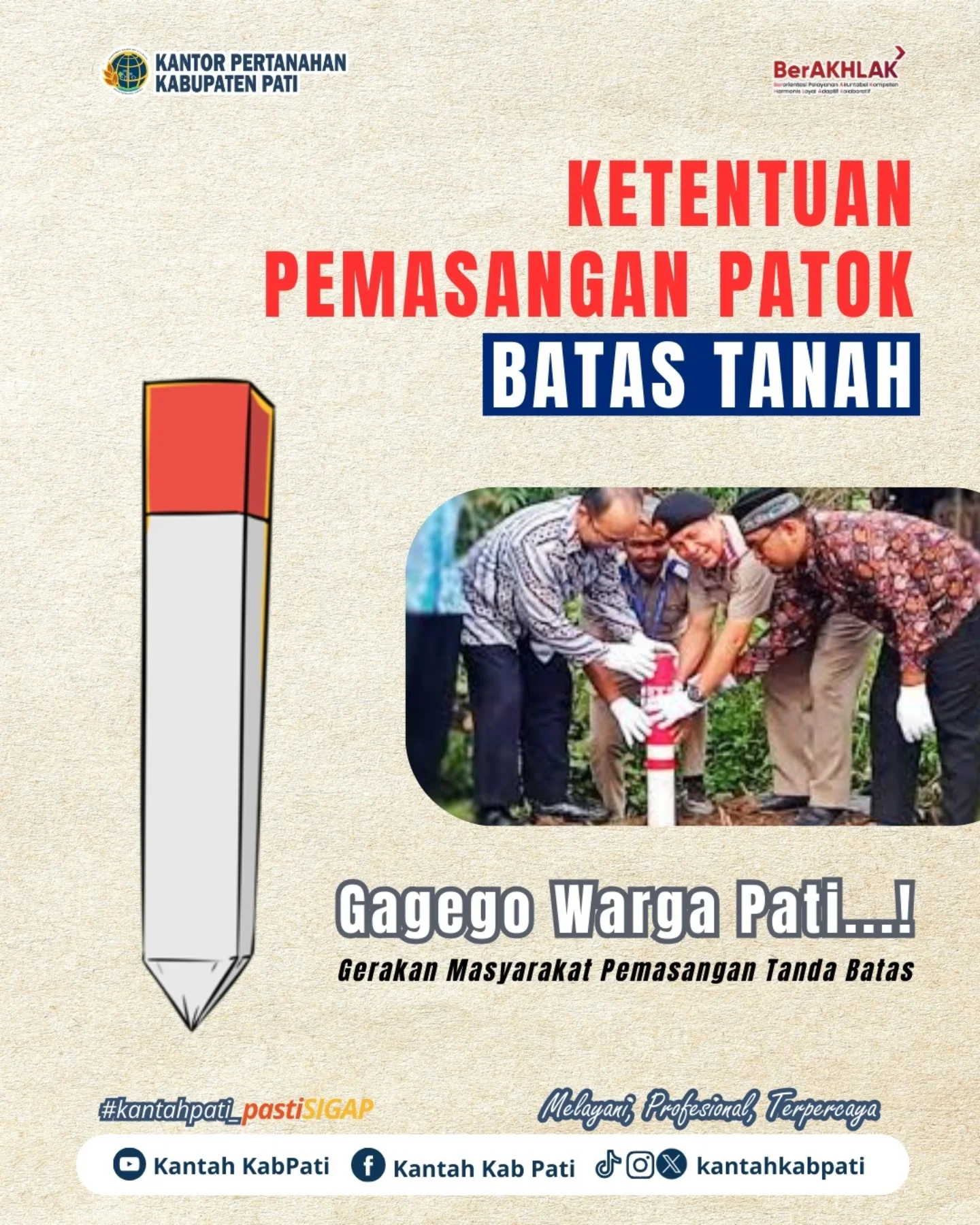 Dalam upaya meningkatkan kesadaran masyarakat terhadap pentingnya kepastian hukum atas tanah, Kantor Pertanahan Kabupaten Pati menggelar kampanye “Gerakan Masyarakat Pemasangan Tanda Batas.” Program ini mengajak warga untuk aktif memasang patok batas tanah sebagai bentuk perlindungan hak milik dan pencegahan konflik agraria.