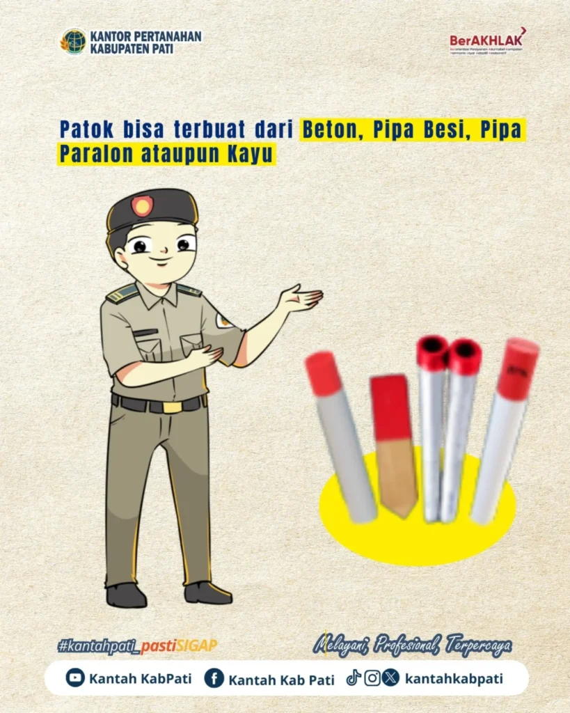 Patok batas tanah adalah penanda fisik yang menunjukkan batas kepemilikan lahan. Patok ini bisa dibuat dari berbagai bahan seperti beton, pipa besi, paralon, atau kayu, dan harus memiliki ukuran minimal 50 cm—dengan 40 cm tertanam di dalam tanah dan 10 cm tampak di permukaan.