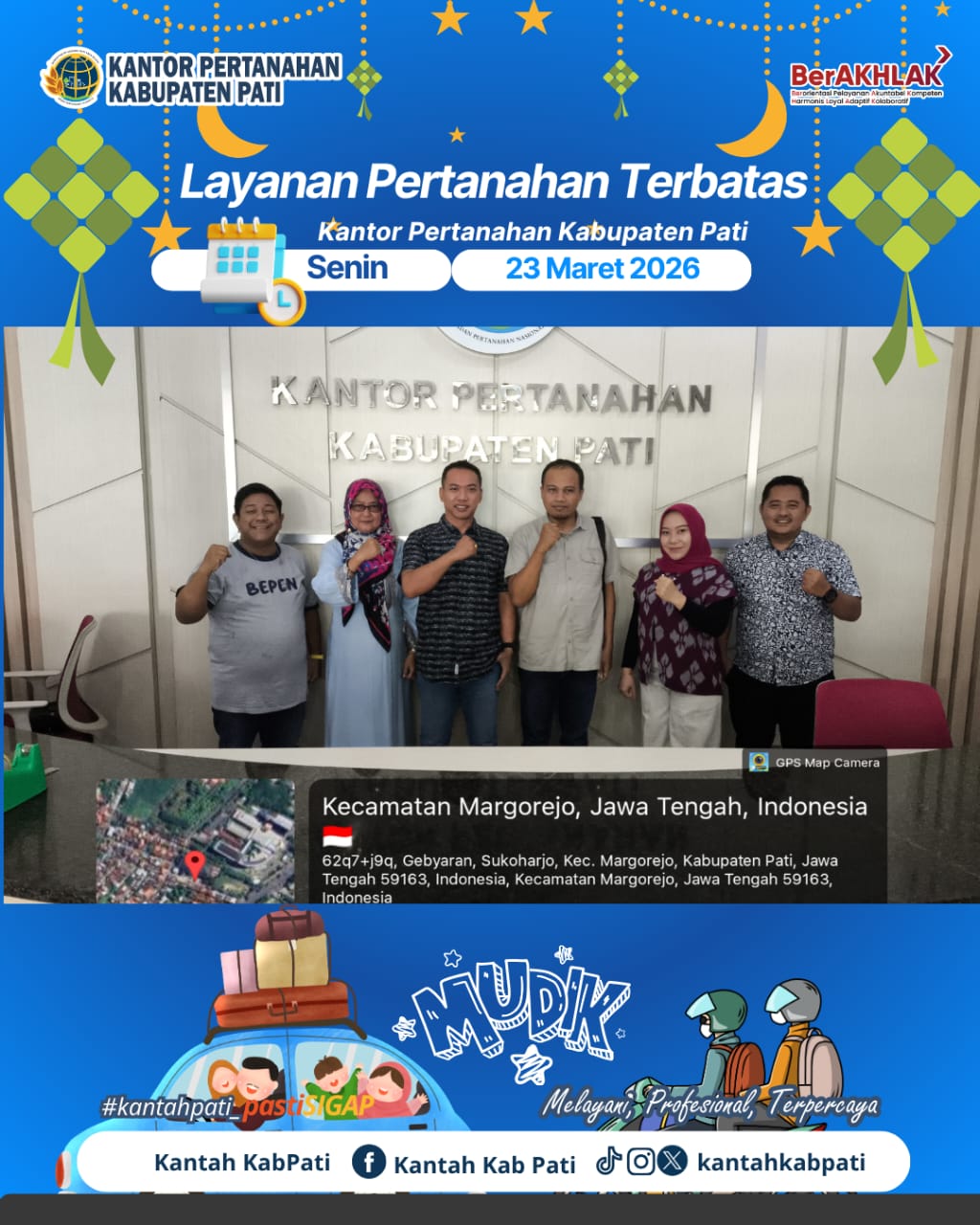 Halo Pemudik Kabupaten Pati, Kami Buka Pelayanan Pertanahan Terbatas Loh. Berikut adalah Pelayanan Pertanahan Terbatas pada Senin, 23 Maret 2026 🥰