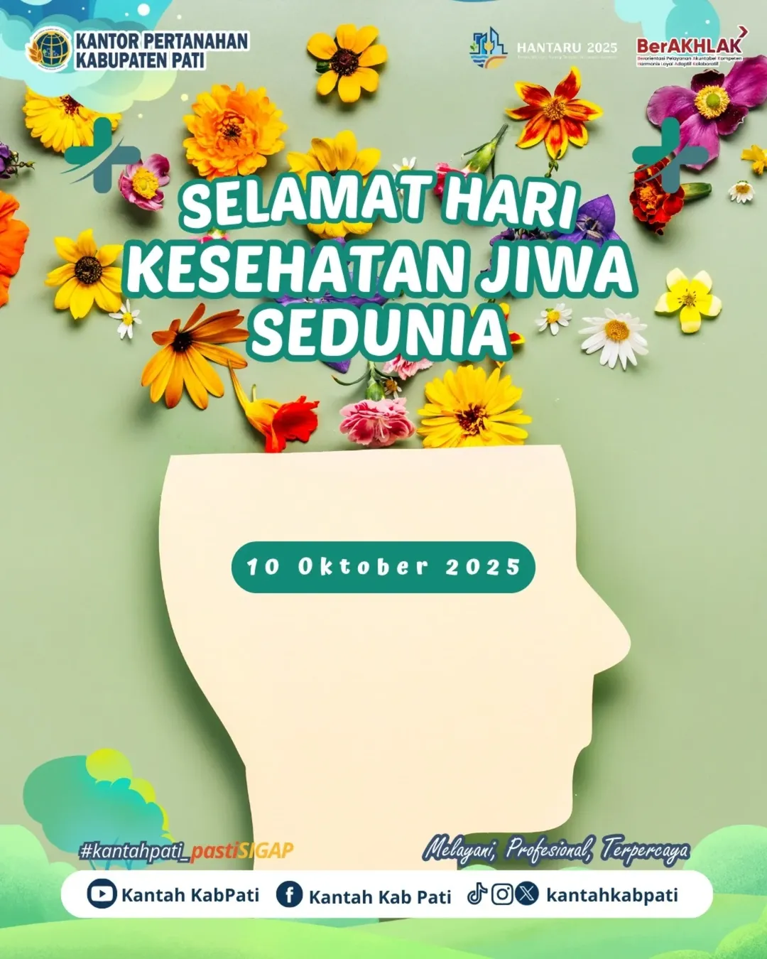 ​Kesehatan jiwa adalah pondasi pelayanan publik yang berkualitas. Dalam semangat BerAKHLAK dan komitmen Melayani, Profesional, Terpercaya, Kantor Pertanahan Kabupaten Pati mengajak seluruh insan pertanahan dan masyarakat untuk lebih peduli terhadap keseimbangan mental di lingkungan kerja dan kehidupan sehari-hari.
